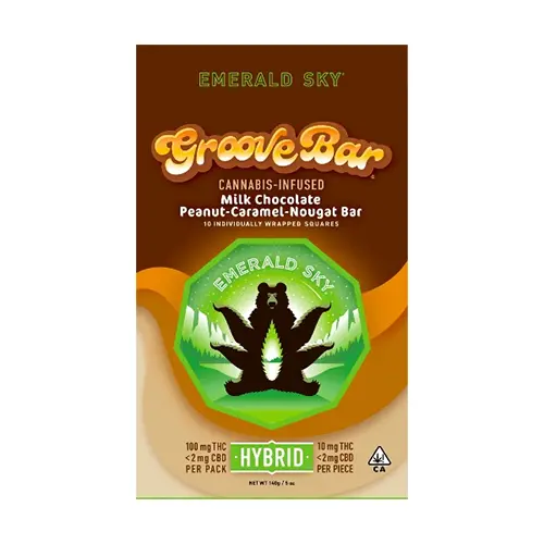 The GrooveBar by Emerald Sky Edibles reimagines a classic chocolate favorite with a cannabis-infused twist. Featuring layers of roasted peanuts, smooth caramel, and soft nougat, each bar is coated in milk chocolate for a familiar taste experience. Designed for consistent dosing, the pack contains ten individual pieces, each infused with 10 mg of THC. This hybrid formulation offers a balanced experience suitable for a range of preferences, combining classic flavor with functional effects.