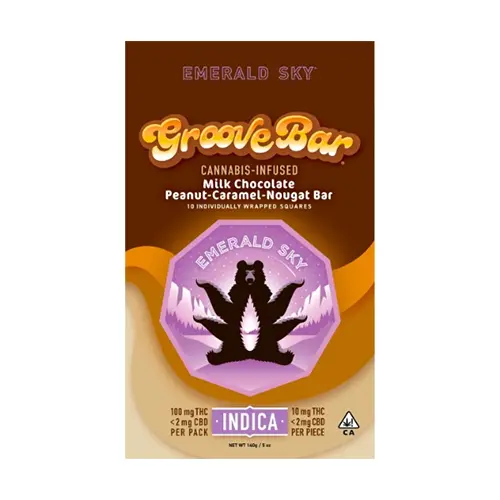The GrooveBar by Emerald Sky Edibles delivers a cannabis-infused take on a time-honored chocolate favorite. Combining roasted peanuts, creamy caramel, and soft nougat, each bite is wrapped in smooth milk chocolate for a familiar and satisfying taste. With ten individual pieces, each containing 10 mg of THC, the bar is portioned for convenience and consistency. This indica formulation is intended for a more relaxing experience, pairing rich flavor with calming effects.